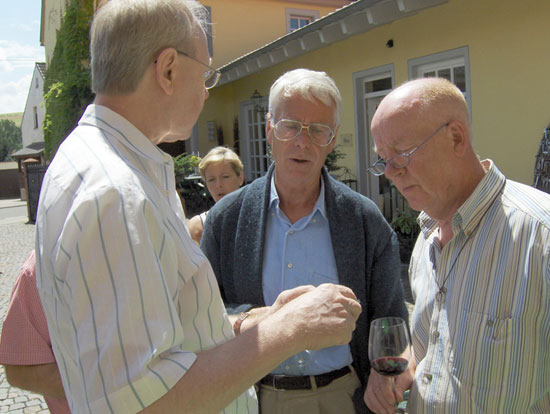Mit einem alten Rohac-Korkenzieher scheiterte der Webmaster an einem bröseligen Korken. Gegen die Fingerfertigkeit unseres Freundes Ernst Kaeshammer mit einem Federzungen-Zieher hatte der Korken aber keine Chance.